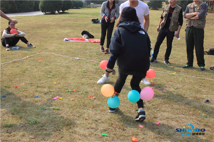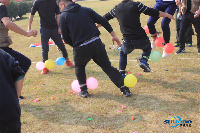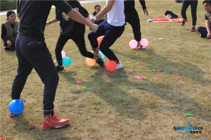 吃罷午飯,休息了一會(huì),開始下午的活動(dòng),一開始就是比較激烈的“踩氣球”,每組出兩名隊(duì)員,腿上每個(gè)人綁四個(gè)氣球,三分鐘時(shí)間,在圈內(nèi),看最后剩余的氣球數(shù),第一輪紅隊(duì)兩名隊(duì)員比較給力,合力把其他隊(duì)都消滅了,自己剩余5個(gè)氣球,第二輪第三輪雖然戰(zhàn)績不佳,但是由于第一局的絕對優(yōu)勢,取得最終的勝利。