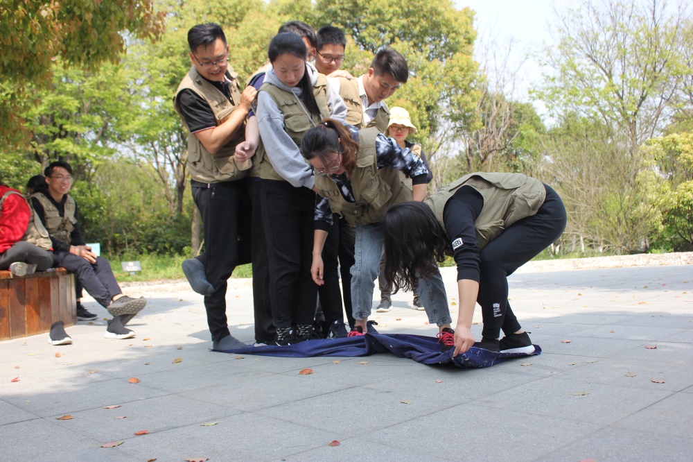 首先是翻葉子,這算是一個比較經(jīng)典的游戲了,每組隊員站在一塊布上,然后在所有人不得以身體任意部位碰到布以外的地方,把布翻過來??茨慕M時間最短。旨在提高大家的協(xié)作能力和團(tuán)隊精神。最終紅隊更勝一籌,穩(wěn)中求快就會勝利。