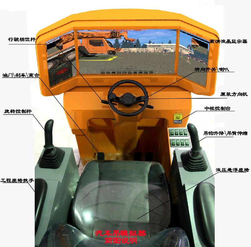該模擬教學設(shè)備硬件由懸浮式座椅、駕駛座艙、底座平臺、PC系統(tǒng),視景顯示器,方向機,檔位桿,操作手柄,IC卡讀寫裝置、360視角調(diào)整搖桿、油門、離合、剎車踏板,轉(zhuǎn)向開關(guān),數(shù)據(jù)采集卡、控制臺及各種功能控制按鈕組件等組成。設(shè)備采用與真實汽車起重機相同的操作部件,逼真的操作手感,使得其操作功能、操作感覺與真機完全吻合;