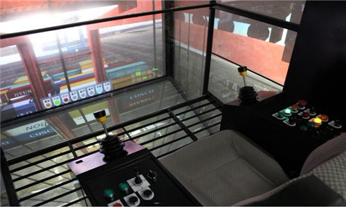 駕駛室系統(tǒng)采用真實的操作臺,包括一套完整的操作臺(內(nèi)含各種操作手柄、開關(guān)、功能按鈕、護(hù)欄、以及司機(jī)座椅等),其原來的玻璃窗口用視景系統(tǒng)的投影屏幕替代,通過“窗口”可以看到從高性能投影儀投放在屏幕上的視景景象和操作情況。音響系統(tǒng)可以產(chǎn)生實際作業(yè)中的各種聲音(如電動機(jī)起、制動,大、小車運行,貨物撞擊,車間環(huán)境聲音等等)以及各種現(xiàn)場聲響。